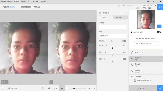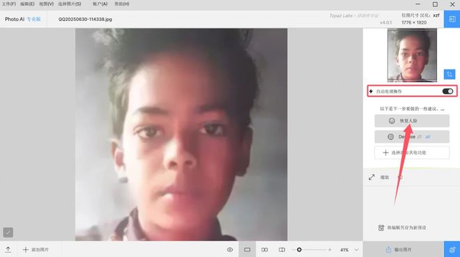 然后导入我们需要修复的照片,这里我先来修复一张像素极低的模糊照片,打开自动处理操作,然后软件会识别你导入的照片,给予你修复的建议,对于没有任何图片修复技术的普通用户来说非常便捷,我们只需要根据建议来点击各个选项即可自动完成修复。