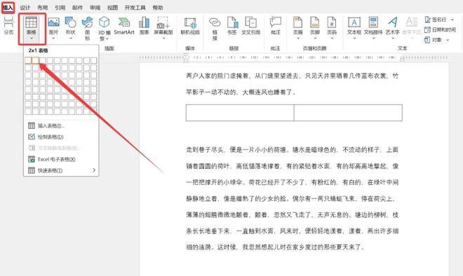 首先把光标移动到需要插入图片的文章位置,然后在菜单栏中点击插入表格,如果是要插入两张并排的图片,那么就选择1行2列。