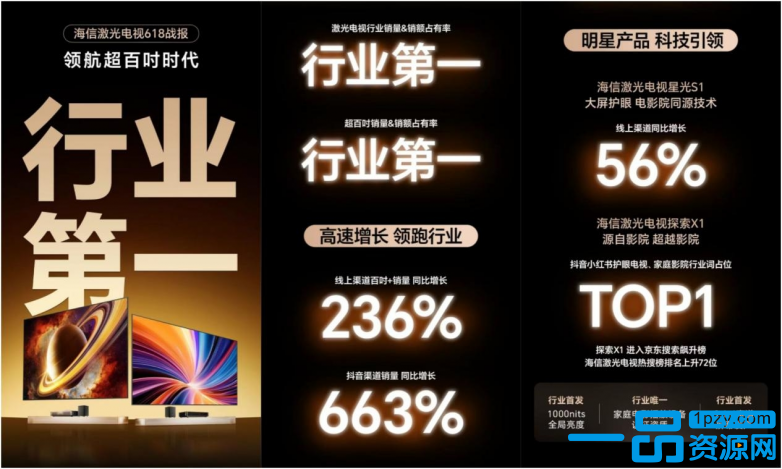 硬核激光显示技术与AI智控交互的软实力深度融合,其产生的强大势能在刚刚落幕的618年中大促中,得到了市场的热烈回应与充分验证:海信激光电视一举登顶行业销量与销额占有率榜首,同时在超百吋大屏领域,其销量与销额占有率也高居行业第一。 其中,线上渠道百吋以上销量同比增长236%,抖音渠道销量更是实现了爆发式的663%同比增长。